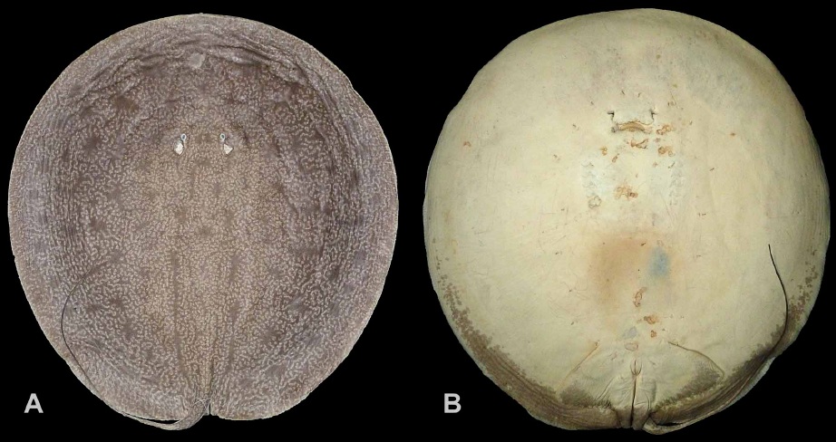 | FIGURE 11. Holotype of Heliotrygon rosai, n. sp., in dorsal (A) and ventral (B) views (MZUSP 104996, adult male, Baía de Marajó, Pará state, Brazil; 984 mm TL, 604 mm DL, 577 mm DW). |