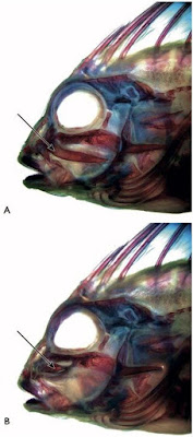 X-ray of a whiskered prowfish (Neopataecus waterhousii). Cleared and stained specimen of a warty prowfish (Aetapcus maculatus) for comparison to the X-ray