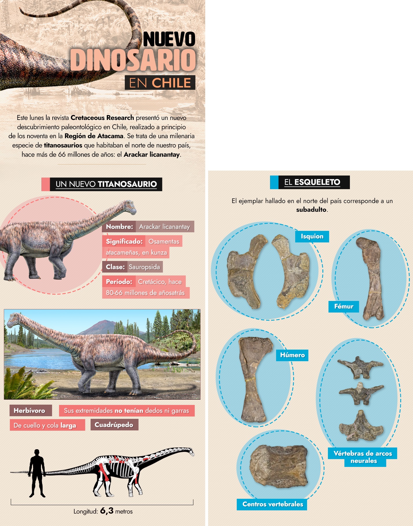 • Arackar licanantay represents a small subadult individual, with an estimated length of 6.3 m.