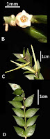 | Dischidia ruscifolia Decne ex Becc. A. Habitat, B. Habit, C. Flower top view, D. Flower side view. Photos by N.K. Alfeche. Scale bar: A = 1 cm; B = 5 mm; C = 1 mm; D = 1 mm. |