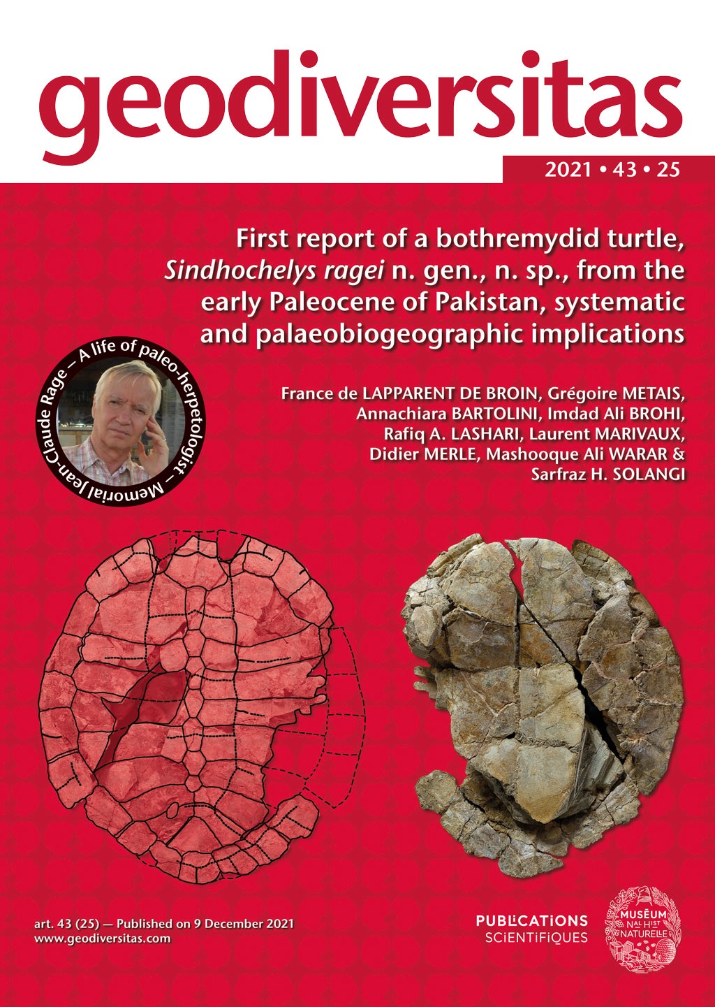 France de Lapparent De Broin, Grégoire Métais, Annachiara Bartolini, Imdad Ali Brohi, Rafiq A. Lashari, Laurent Marivaux, Didier Merle, Mashooque Ali Warar and Sarfraz H. Solangi. 2021. First Report of A Bothremydid Turtle, Sindhochelys ragei n. gen., n. sp., from the early Paleocene of Pakistan, Systematic and Palaeobiogeographic Implications. GEODIVERSITAS. 43(25); 1341-1363. [This article is a part of the thematic issue Memorial Jean-Claude Rage: A life of paleo-herpetologist]