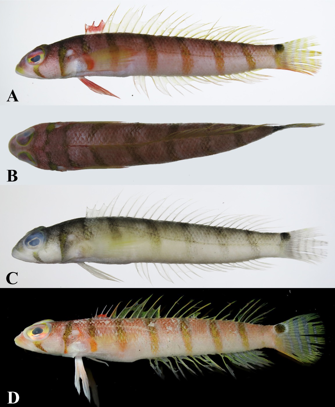 Diagnosis. A species of Parapercis with band across head, six transverse bands on body and blade-like bar below eye; numerous small pores connected by canals forming about 9–10 vertical rows on cheek, opercle, and subopercle; scales on nape extending anteriorly to level of posterior margin of eyes; large spine on posteroventral corner of subopercle; very narrow interorbital space (1.7‒2.0% SL); 4 dorsal-fin spines, each spine progressively longer, last spine entirely connected by membrane to first dorsal-fin ray; four pairs of canine teeth anteriorly in lower jaw; palatine teeth present, in two rows; and vomerine teeth stout, in two rows (revised from the original description).