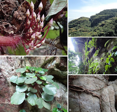 Habitat and ecology — Benna alternifolia occurs on vertical sandstone rock, in deep shade in canyons 10–100 m deep (Fig. 3), and on vertical sandstone rock in deep shade of trees, at 300–800 m altitude. Plants occur only under overhanging rocks (Fig 3B), out of reach of falling rain drops, and only on vertical rock where water is seeping all year round, within reach of the several-meter-long roots. In this habitat, the perennial, evergreen, herbaceous plants, which do not have a rootstock, can continue to grow during the six-month dry season.