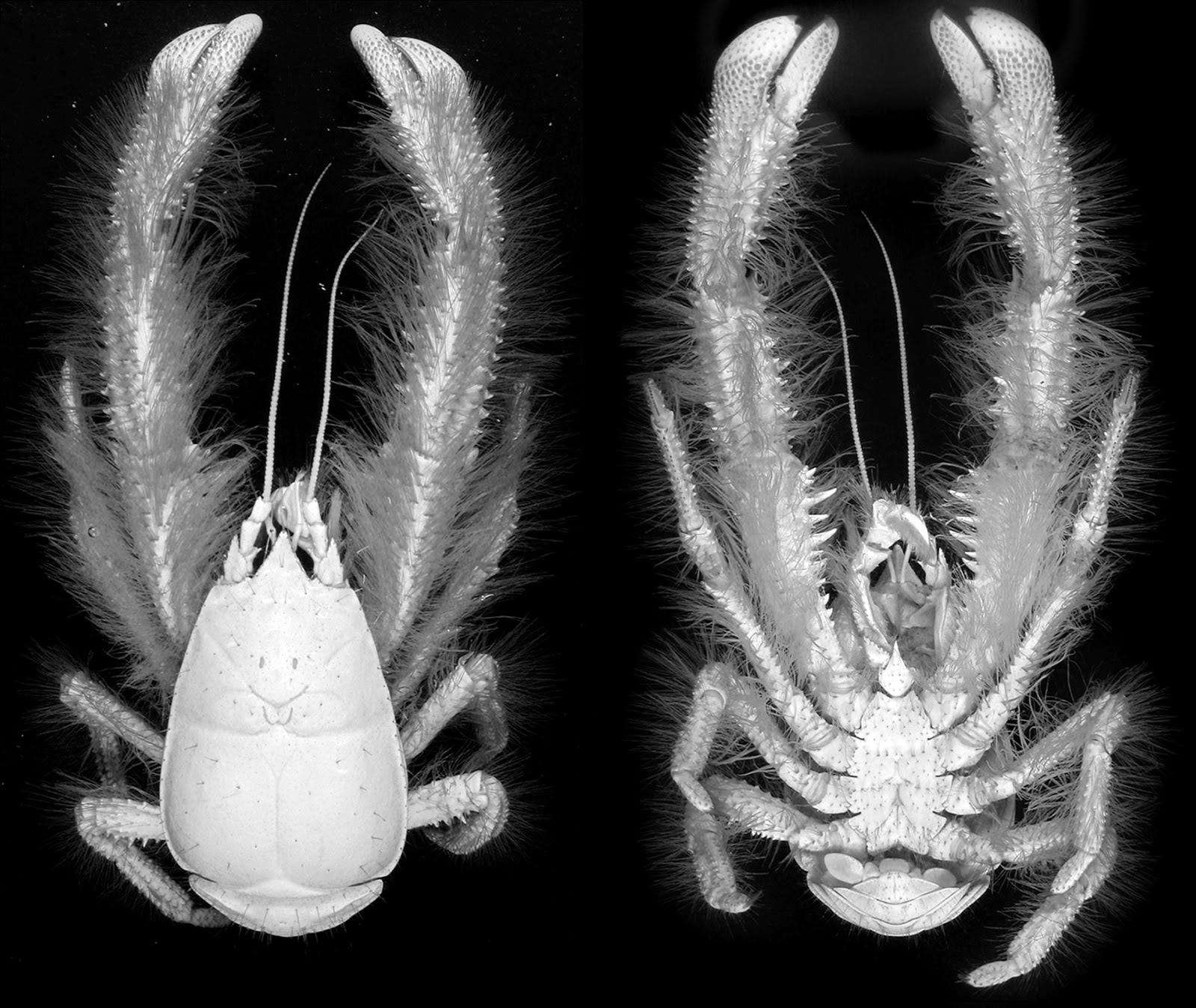 | FIG. 3. — Kiwa hirsuta n. gen., n. sp. male holotype (MNHN-Ga 5310); A, dorsal view; B, ventral view. |
